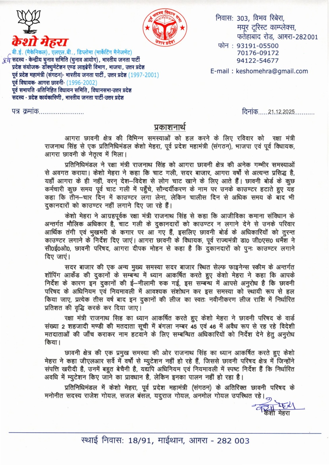केशो मेहरा ने रक्षामंत्री को बताया कि चाट गली, सदर बाजार, आगरा वर्षों से प्रसिद्ध है। यहां शहर ही नहीं बल्कि देश-विदेश से लोग चाट खाने आते हैं। छावनी बोर्ड के कर्मचारियों ने कुछ समय पूर्व चाट गली में सौन्दर्यीकरण के नाम पर चाट वालों के काउण्टर यह कहते हुए हटवा दिए कि तीन-चार दिन बाद लगा लेना, लेकिन चालीस दिन से अधिक समय के बाद भी दुकानदारों को काउण्टर नहीं लगाने दिए जा रहे हैं।