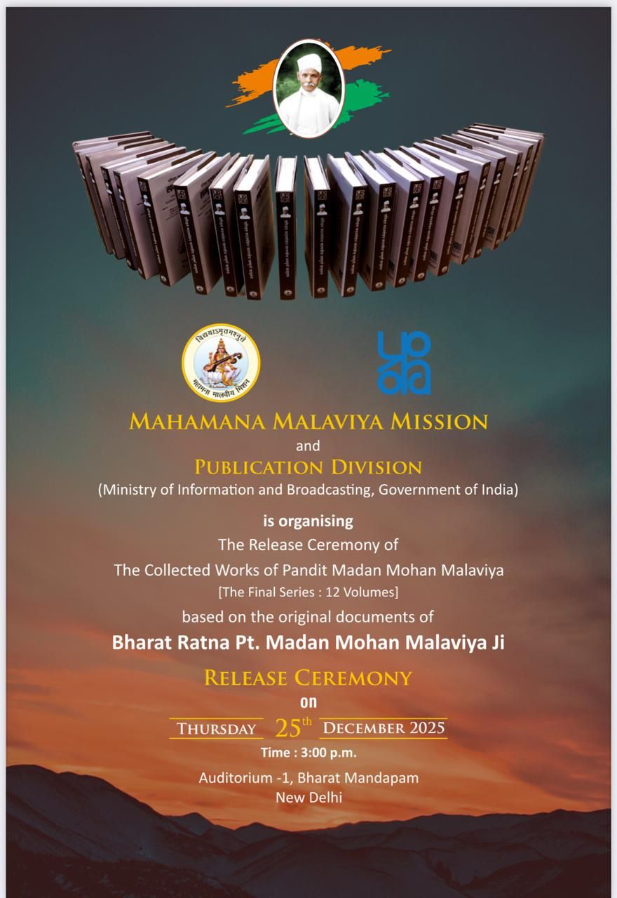 आगरा। भारत रत्न, राष्ट्रऋषि पं. मदन मोहन मालवीय के अमर विचारों, राष्ट्र सेवा और सांस्कृतिक चेतना को अक्षुण्ण रूप में भावी पीढ़ियों तक पहुंचाने के लिए संकलित “पं. मदन मोहन मालवीय सम्पूर्ण वाङ्मय (अंतिम श्रृंखला 12 खण्ड) का लोकार्पण समारोह गुरुवार 25 दिसम्बर को अपरान्ह 3 बजे, भारत मंडपम, ऑडिटोरियम नई दिल्ली में किया जा रहा है।
