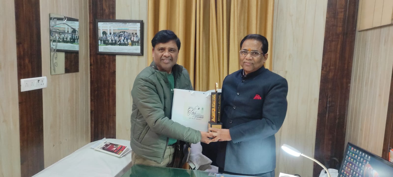 कवि पवन आगरी ने उनके कार्यालय में जाकर दिया साहित्योत्सव प्रतीक चिन्ह