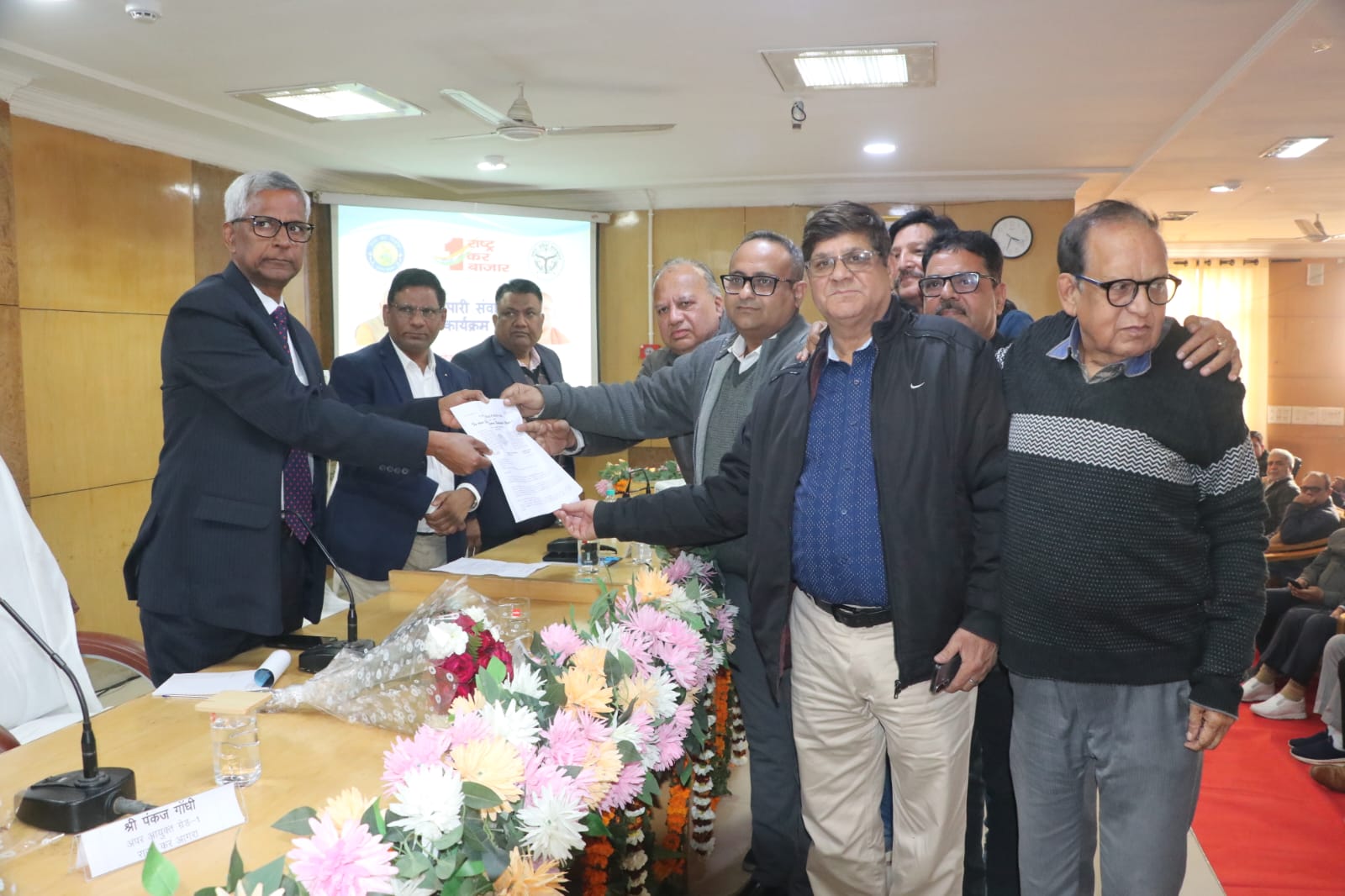 इस मौके पर व्यापार संगठनों के पदाधिकारियों में आगरा व्यापार मंडल के अध्यक्ष टीएन अग्रवाल, जय पुरसनानी, पंकज अग्रवाल, दि शू फैक्टर्स एसोसिएशन के अध्यक्ष विजय कुमार सामा, लघु उद्योग भारती के अध्यक्ष विजय गुप्ता, निखिल गुप्ता, सीए ब्रान्च आगरा के चेयरमैन, गौरव सिंघल, फेडरेशन ऑफ ऑल इण्डिया के बृजेश पंडित, ईट भट्ठा एसोसिएशन के अध्यक्ष देवेन्द्र सिंह, शशी रंजन, टैक्शेसन बार एसोसिएशन के अध्यक्ष अक्षय कुलश्रेष्ठ, संजीव वशिष्ठ आदि मौजूद रहे। कार्यक्रम का संयोजन गुलाब चन्द्र, अपर आयुक्त, अजीत कुमार सिंह और गोपाल तिवारी, संयुक्त आयुक्त और मृत्युजंय कुमार सिंह उपायुक्त द्वारा किया गया। संचालन जितेन्द्र कुमार द्वारा किया गया।