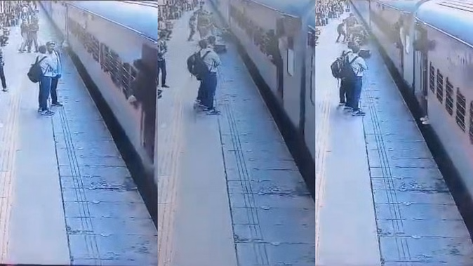 घटना आगरा कैंट रेलवे स्टेशन के प्लेटफार्म नंबर एक की है। बृहस्पतिवार दोपहर पंजाब मेल एक्सप्रेस आगरा कैंट स्टेशन पर पहुंची। ट्रेन अपने ठहराव के बाद रवाना हुई। इसी दौरान एक यात्री भागता हुआ पहुंचा और चलती ट्रेन पर चढ़ने का प्रयास किया। ट्रेन में चढ़ने के दौरान यात्री प्लेटफार्म पर गिर गया। इस दौरान ट्रेन की चपेट में आने से पहले ही मौके पर तैनात आरपीएफ के सिपाही श्रीकांत ने देवदूत बनकर दौड़कर यात्री को संभाला। इससे ट्रेन की चपेट में आने से यात्री बाल-बाल बच गया। ट्रेन के रुकने पर यात्री को कोच में चढ़ा दिया गया। ये हैरान कर देने वाली घटना स्टेशन के प्लेटफार्म पर लगे सीसीटीवी कैमरे में कैद हो गई जिसका वीडियो सोशल मीडिया पर वायरल हो रहा है।